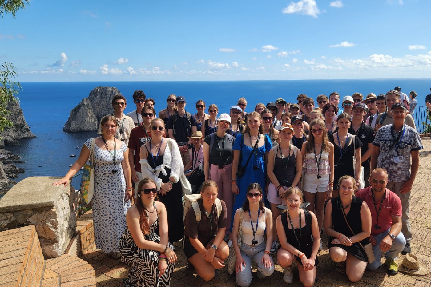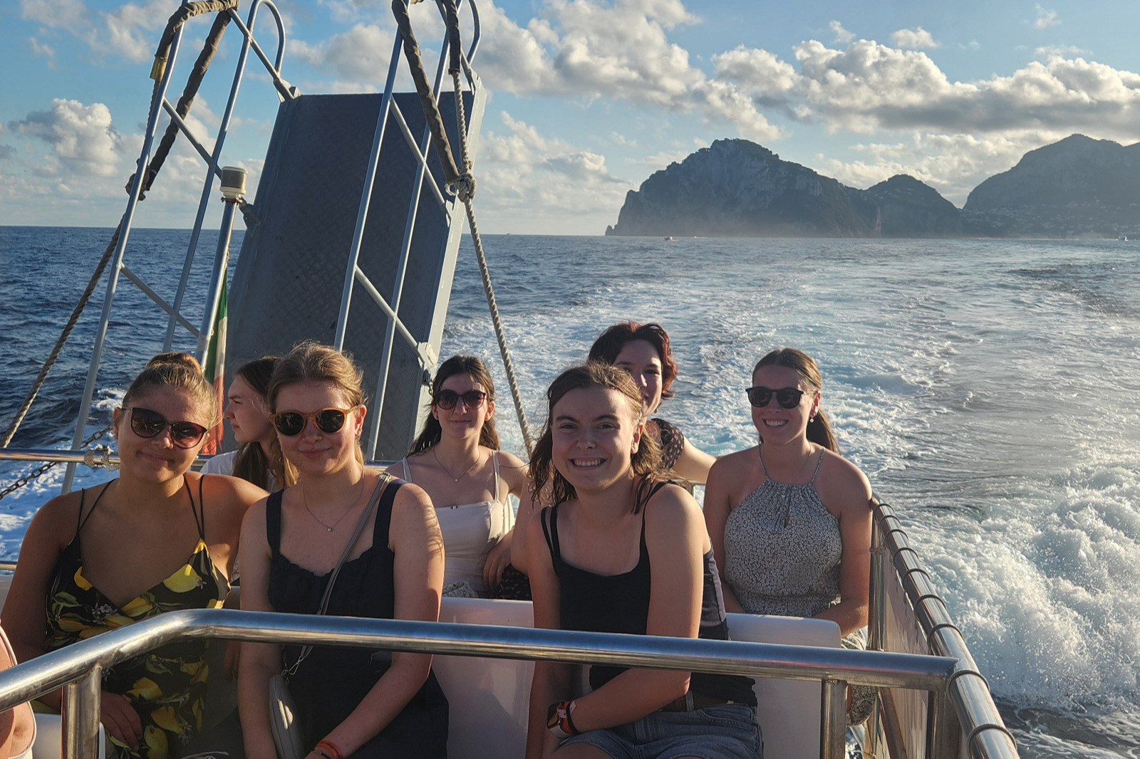 Am folgenden Morgen brachte ein Schnellboot die Reisegruppe auf die pulsierende Insel Capri. Nachdem man dem Trubel im quirligen Hafen entkommen war, konnten die Schüler auf einer Bootsfahrt bis zu den Faraglioni-Felsen das türkisblaue Wasser, mehrere Grotten und Felsformationen – so z.B. einen „Elefantenrüssel“ oder eine „Madonnenstatue“ – an der Steilküste bestaunen. Aber Capri lässt kein langes Verweilen zu. Zu wertvoll ist ein Tag auf der sonnenverwöhnten Insel mit ihren Düften und ihrer üppigen Pflanzenwelt. Deshalb ging es gleich nach Rückkehr in den Hafen mit Minibussen hinauf nach Anacapri, auf Straßen, die den Fahrern alles Können abverlangen. Im Garten der wunderbaren Villa San Michele konnte man etwas Ruhe finden und den Blick über die Insel schweifen lassen. Wer wollte, durfte eine Sphinx aus Marmor streicheln; und wer abergläubisch ist, darf nun nach dieser Berührung davon träumen, nach Capri zurückzukehren. Anschließend ging es nach einer Mittagspause nach Capri-Stadt. Hier lotste Gaetano die Oberpfälzer durch schmale Gässchen abseits der Touristenströme zu den Augustusgärten, einer Parkanlage, von der aus man einen herrlichen Blick hat einerseits auf die malerischen Faraglioni-Felsen und andererseits auf die Via Krupp, die Ende Juni 2023 nach jahrzehntelanger Sperrung wieder für Besucher geöffnet wurde.