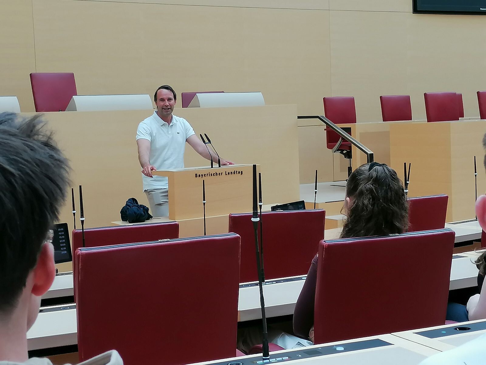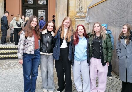 Aufbruch früh am Morgen mit dem Taxi nach Deggendorf, von wo aus uns, d.h. 10 Schülerinnen der 10 a und der 10b und Frau Stahl, der Bus der EUREGIO Bayrischer Wald – Böhmer Wald - Unterer Inn nach München brachte. Im Rahmen des Gastschuljahres 2025/26 hatte uns Frau Dreher, die Leiterin des Austausches, zu der Fahrt nach München eingeladen. Pünktlich erreichten wir das Maximilianeum. Nach der Sicherheitskontrolle wurden wir augenzwinkernd mit der bayerischen Weisheit „Ohne Mampf kein Kampf“ begrüßt und in die Landtagskantine, die eher einem gehobenen Speiselokal gleicht, eingeladen. Nach einem Mittagessen und einer Führung durch das Maximilianeum – das heute neben dem Landtag die Stiftung Maximilianeum zur Förderung besonders begabter bayerischer Studierender beherbergt – folgte eine lebhafte Stunde mit dem Abgeordneten Max Deisenhofer. Die bayrischen und tschechischen Schüler nutzten die Zeit so intensiv für Fragen, dass wir das Zeitlimit sogar um fünf Minuten überschritten.